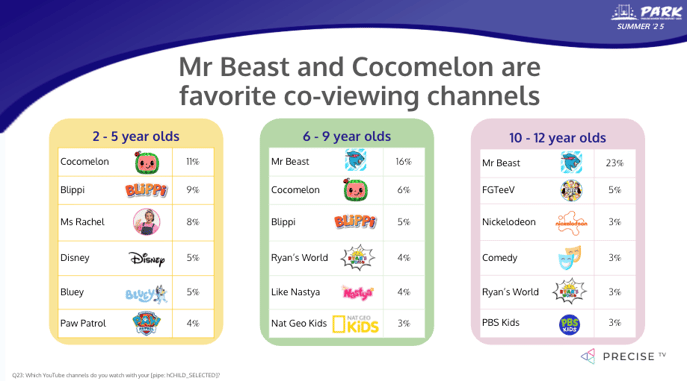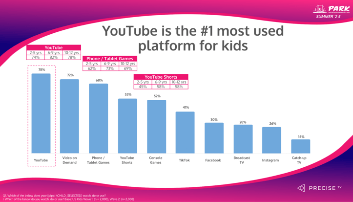 NEW YORK -- September 24, 2025 -- YouTube is now the dominant hub of family attention in the United States. According to the eighth installment of the Precise Advertiser Report: Kids (PARK) from Precise TV, the contextual video ad tech platform driving business outcomes for brands, 78% of Gen Alpha children aged 2 to 12 use YouTube, eclipsing video-on-demand services (72%), phone/tablet games (68%), and TikTok (41%). Across every age group, YouTube also ranks as the favorite platform, with an overwhelming 82% of 6-9 year olds calling it their top choice.